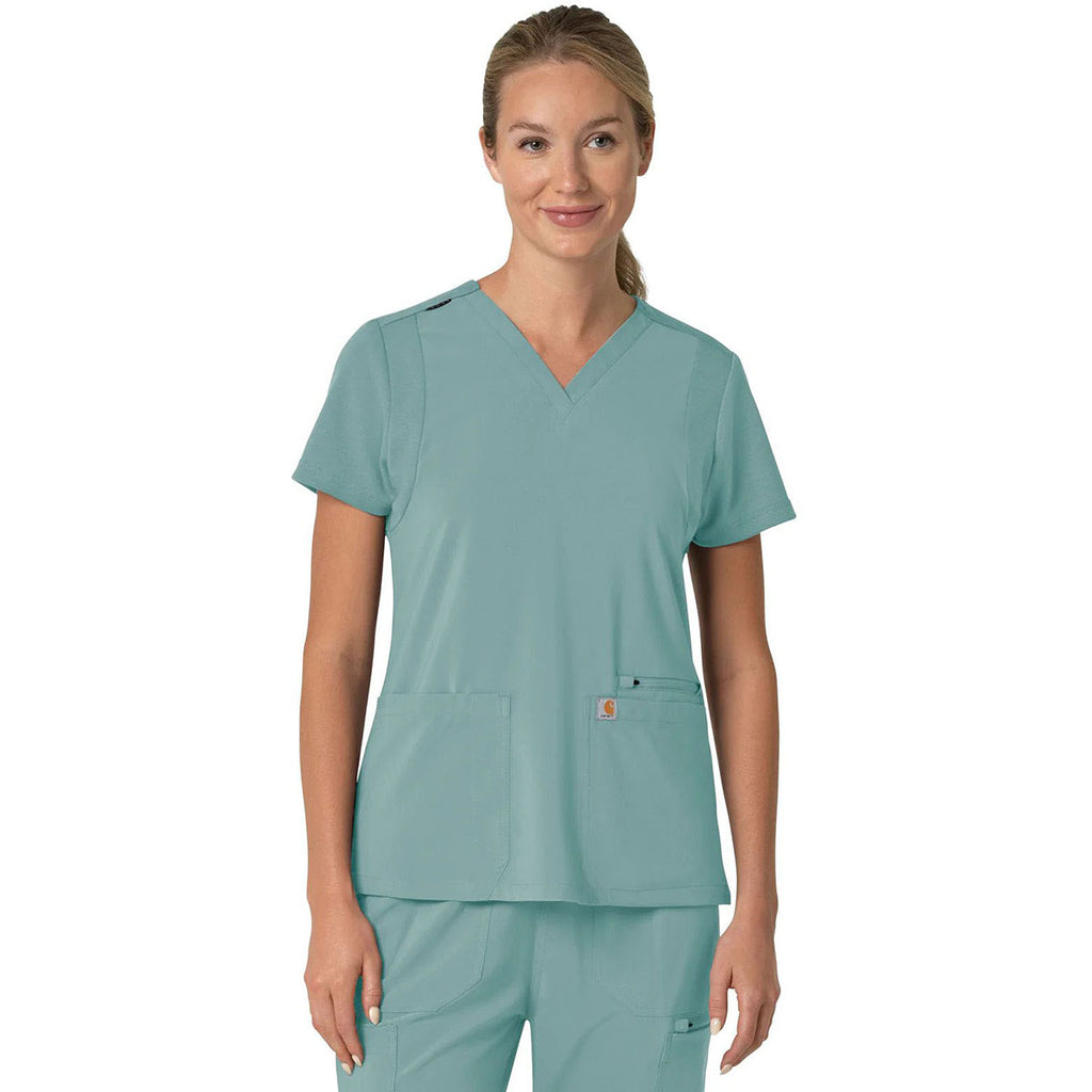 Carhartt Women's Summer Blue Three-Pocket Flex Panel V-Neck Scrub Top with a corporate logo is the best way to identify staff while offering a functional option for work. The shoulder badge loop, zippered cell phone pocket, and two large patch pockets keep all your necessities at hand whether you just started your nursing shift or are heading out after a long day of work.Highlights