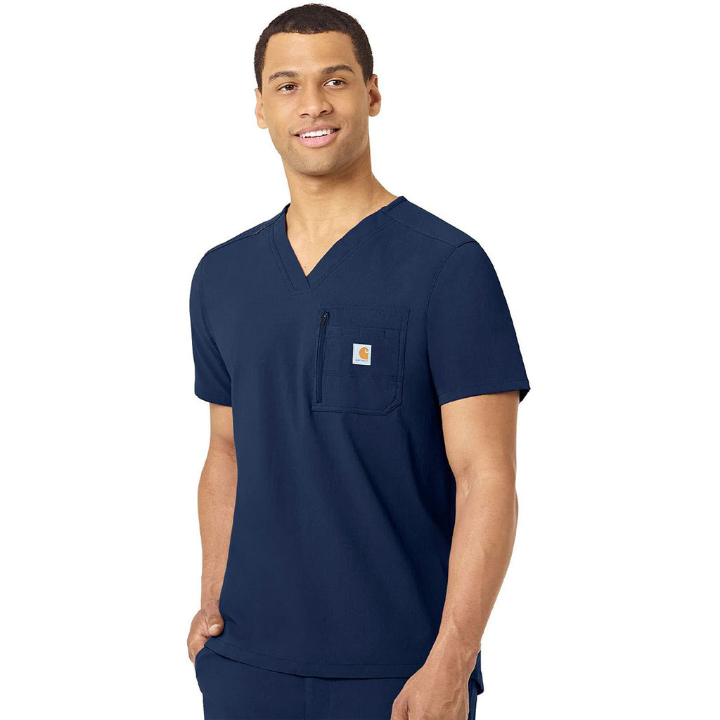 Add embroidery to the Carhartt Men's Navy Two-Pocket Modern Fit Tuck-In V-Neck Top for a versatile option for work. This durable top has Rugged Flex stretch technology and HEIQ Eco Dry for durable water repellency, whether you are saving lives or washing feisty animals. Made for hard work and comfortable days, this is a must-have.Highlights