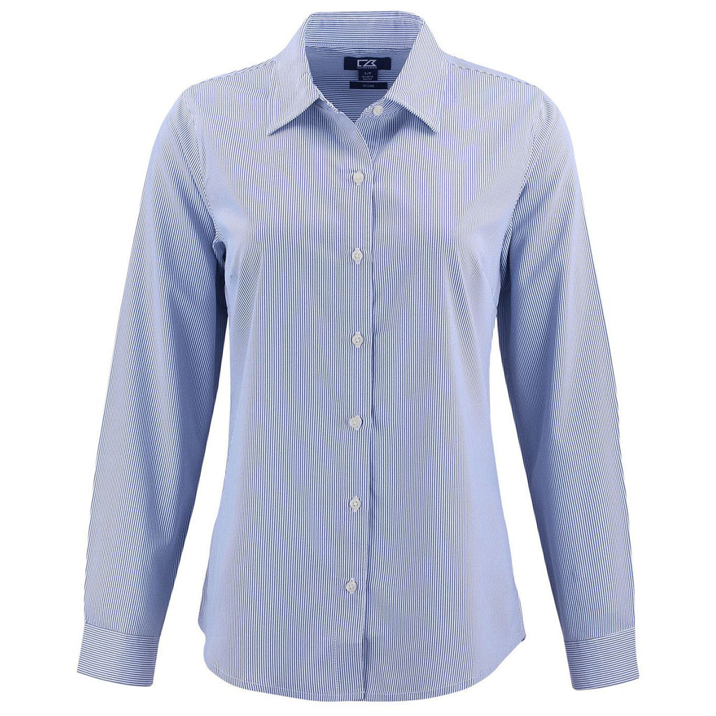 The Cutter & Buck Women's Tour Blue/White Skyline Epic Confidence Recycled Pinstripe Long Sleeve Dress Shirt brings sharp, custom branding to eco-conscious business wear. Designed for comfort and style, its recycled stretch fabric delivers easy movement with tailored lines. Perfect for corporate gifting, uniforms, or resale with elevated sustainability.Corresponding Men's Style: Cutter & Buck Men's Tour Blue/White Skyline Epic Confidence Recycled Pinstripe Long Sleeve Dress Shirt