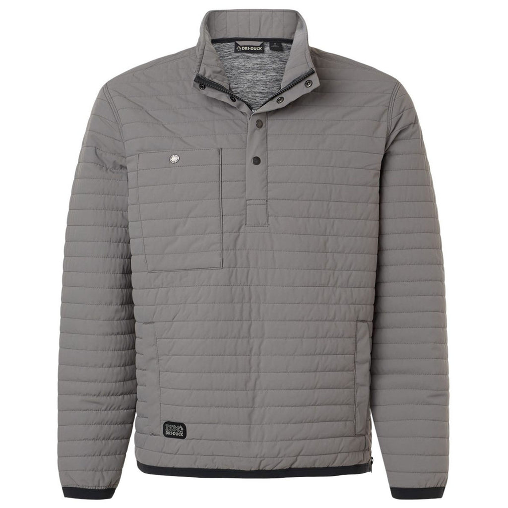 Stay warm in a custom Dri Duck Men's Grey Keystone Quilted Pullover. The 2-layer stretch fabric is bonded to a waterproof membrane with polyfill insulation and a quilted look for style. The dual-closure, four-snap placket protects you whether you are hiking, commuting, or simply going about your day. Give as a gift or add to your logoed apparel options.This product cannot ship outside of the United States