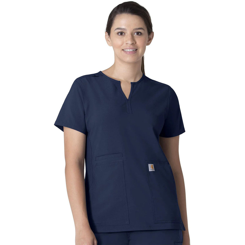 Carhartt Women's Navy Three-Pocket Modern Fit Notch Neck Top with a corporate logo creates a sleek, branded look for staff, employees, or even clients. Built to last, this top has technology to keep you cool, dry, and odor-free throughout the day. The unique neckline adds flair, while multiple pockets keep you organized with supplies at hand.Highlights