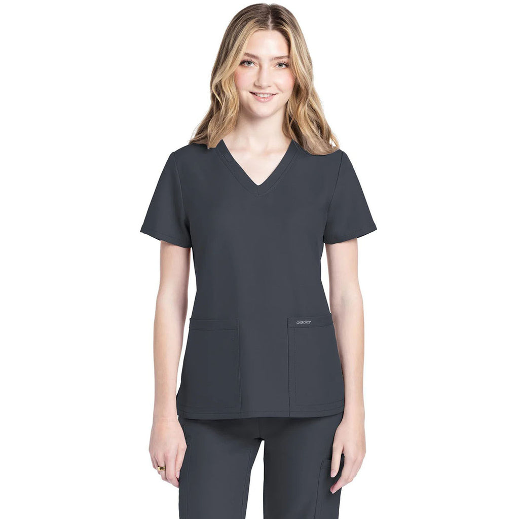 Cherokee Women's Pewter 2-Pocket V-Neck Top with a corporate logo is a must-have for those in multiple professions. Perfect for those in the medical field, those who work with animals, or those who provide in-home care, this comfortable option has side vents, antimicrobial and moisture-wicking technology, and roomy patch pockets.Highlights