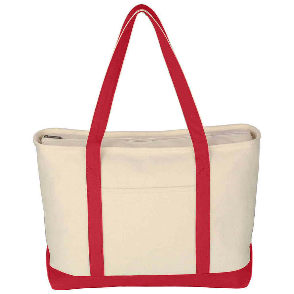 Enjoy the Hit Natural/Red Large Starboard Cotton Canvas Tote Bag with a custom logo. This neutral color bag has a bottom panel and shoulder straps in several color options to fit your needs. The ideal option for the beach, park, or road trip, the roomy tote zips closed for convenience. Give as a gift or add to your logoed items for sale.