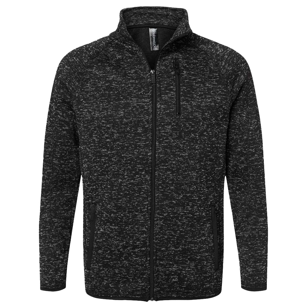Find your softer side with a custom Burnside Men's Heather Black Sweater Knit Jacket. Made of 100% polyester fleece with sweater knit face this full zip sweater jacket keeps you cozy with a stylish edge. The soft fabric is great for cuddling, but tough enough to face the chilly weather when Mother Nature gets cranky. Raglan sleeves offer plenty of room for mobility whether going for a run, hiking, biking, or hanging out. Add a custom logo to use this sweater jacket as an employee gift or to give out at corporate events. Teo covered zippered pockets and a left chest pocket keep keys and a your phone close at hand as you talk business or hang out with friends at a bar. Place an order today with a corporate logo to give these to those who keep your company great.Highlights