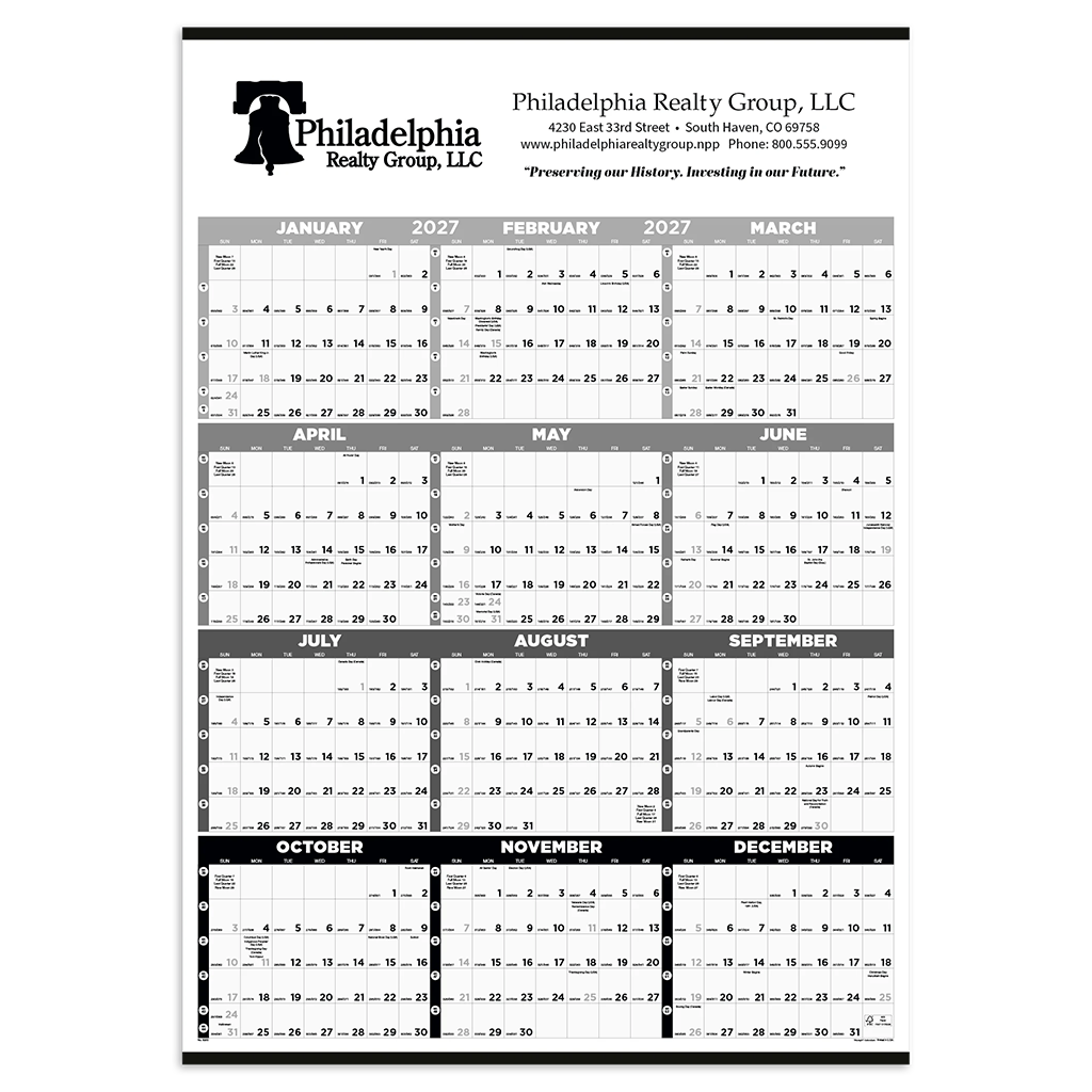 Add your corporate design to the Triumph Calendars Black & White Black & White Time Management Span-A-Year Non-Laminated calendar to make sure the receiver is organized and able to be on time all year. This is a simple, sustainably sourced way to provide a calendar for clients, staff, and anyone else you choose. Order today.The minimum order for this product is 100 pieces.