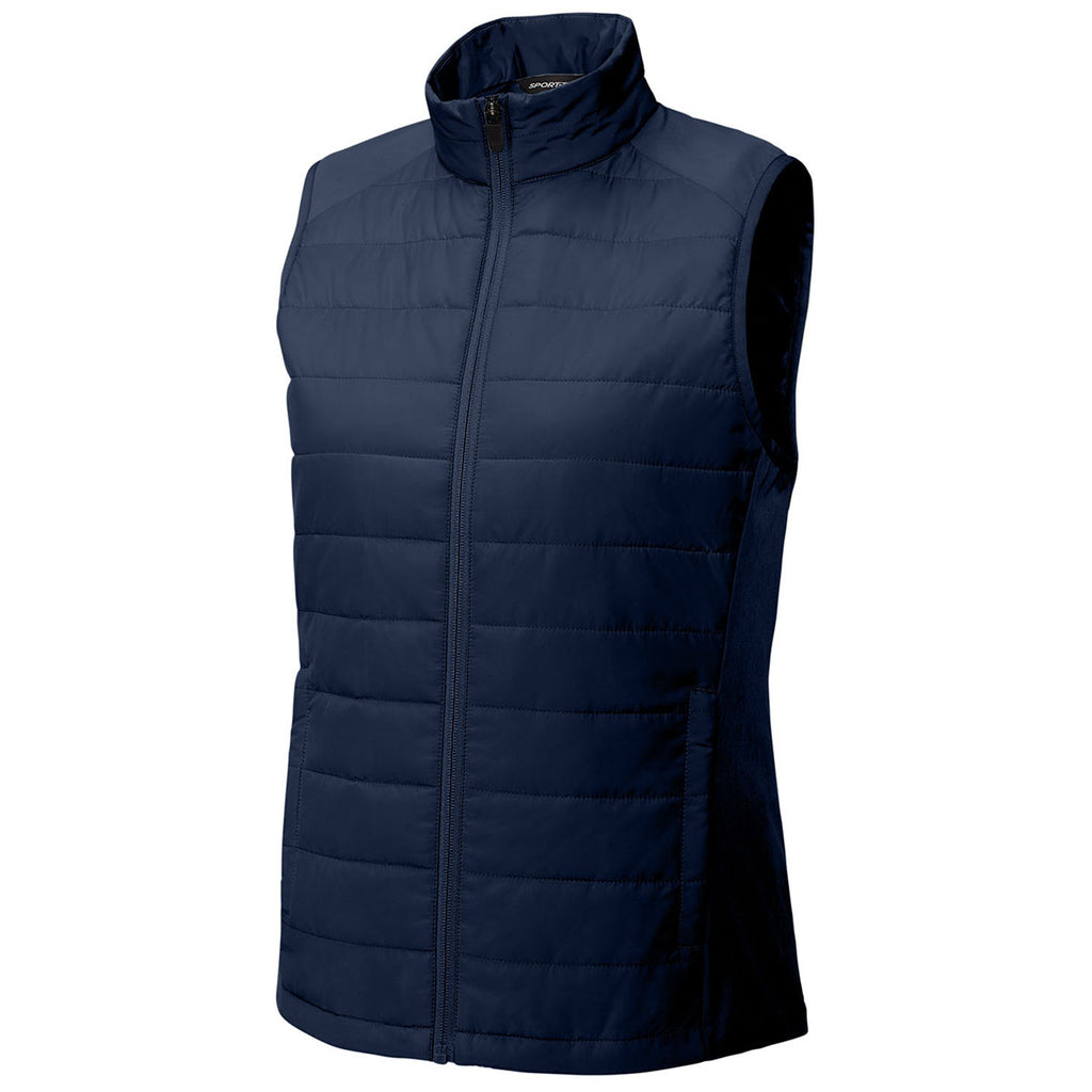 Corporate style blends with comfort in the Sport-Tek Women's True Navy Teknical Hybrid Vest. Lightweight insulation offers just the right amount of warmth, while stretch panels provide flexibility. Add a custom logo to create a versatile branded vest ideal for outdoor events, corporate uniforms, or seasonal gifts that reflect professionalism and practicality.