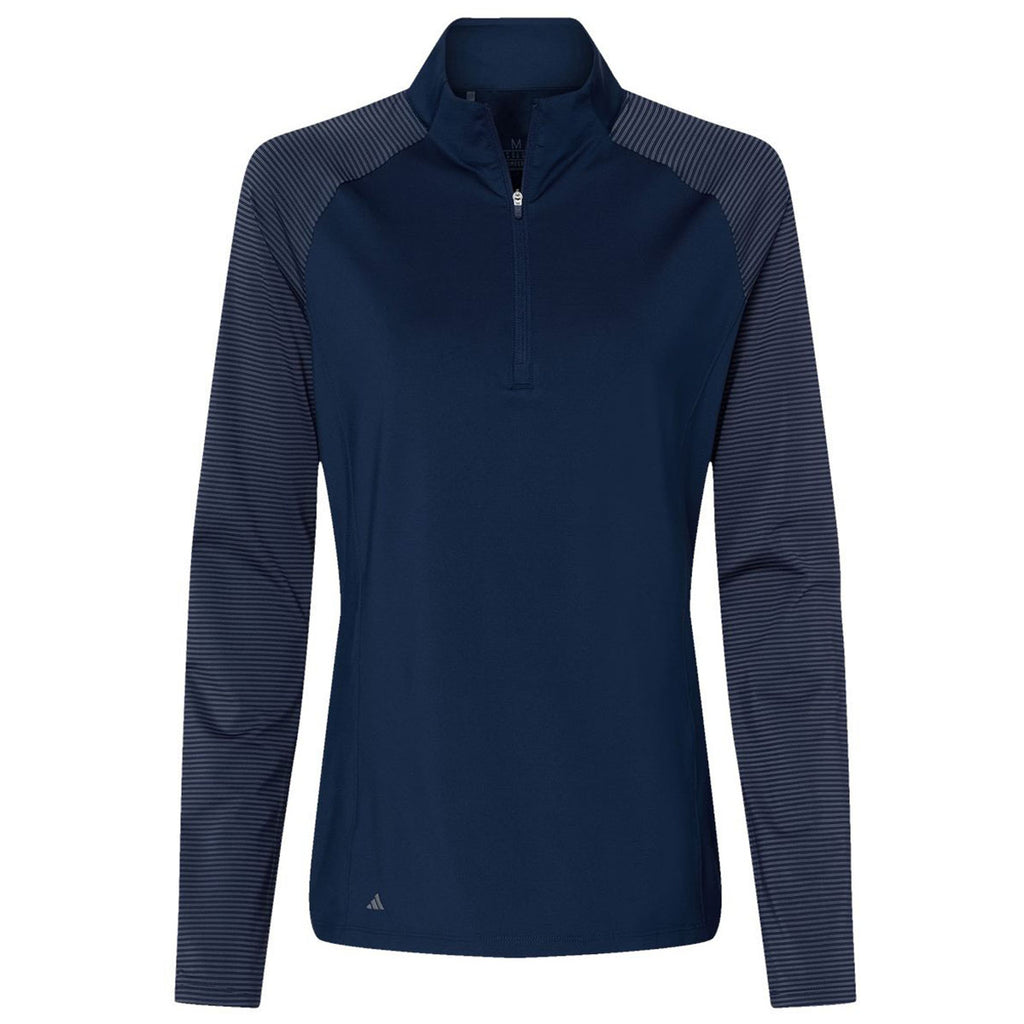 Adidas Women's Team Navy Blue Stripe Block Quarter-Zip Pullover with a corporate logo is a fun way to showcase your company or brand while promoting a healthy lifestyle. This sleek pullover offers moisture-management properties, UPF 50+ protection, and a self-mock collar so you can enjoy a morning jog, play a game of tennis, or hit the gym in style.This product cannot ship outside of the United States