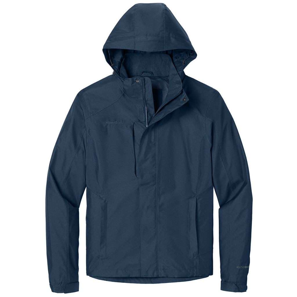 Serious people don't let a little rain stop them from getting work done. The Eddie Bauer Men's River Blue/Grey Steel Rain Jacket is a serious rain jacket for those same serious people. The 5000MM waterproof rating ensures that you'll keep the moisture locked out of your upper body. The storm flap with hook and loop closures will ensure that the jacket's own openings won't let the rain in, either. The 100% polyester dobby shell, the mesh body lining, and the 100% nylon accents are all perfect rain-ready gear; all that's missing is your own company logo on the front.