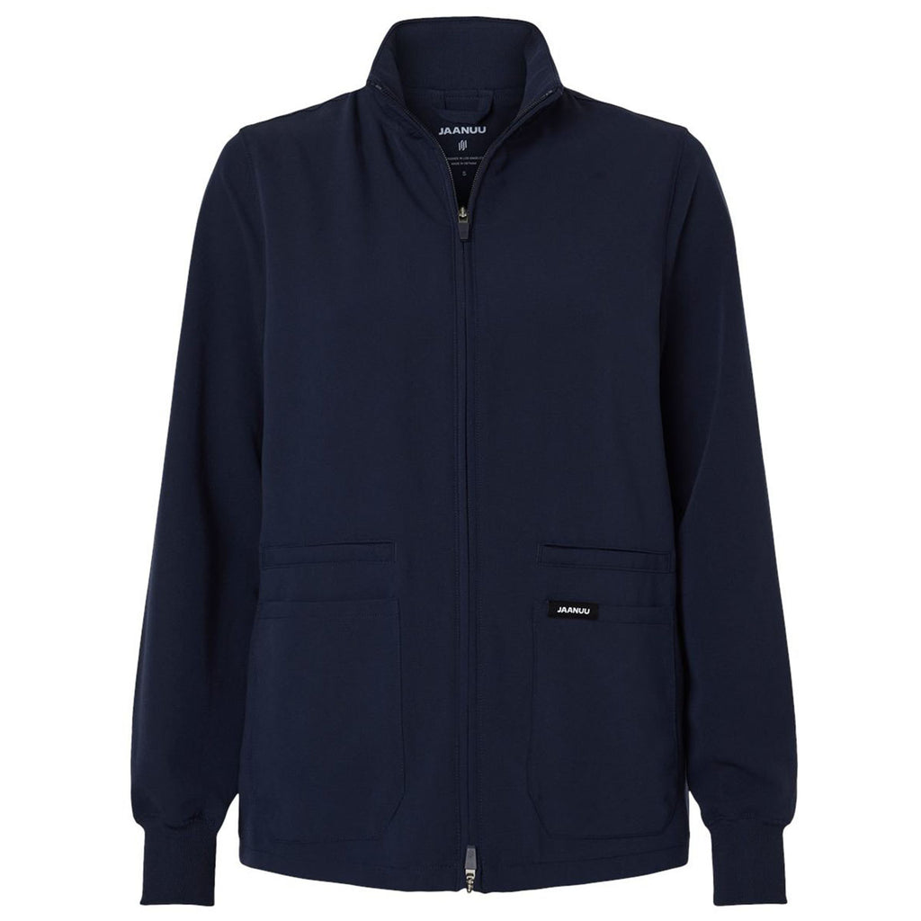 Jaanuu Women's Midnight Navy Ceri Essential Full-Zip 6-Pocket Scrub Jacket with embroidery is a great gift for anyone who works and plays hard. This cozy full-zip jacket easily fits over scrubs or a tee to keep you warm while remaining professional at work, on the commute, or when on the move. Made with multiple pockets and antimicrobial material it is a must-have.
